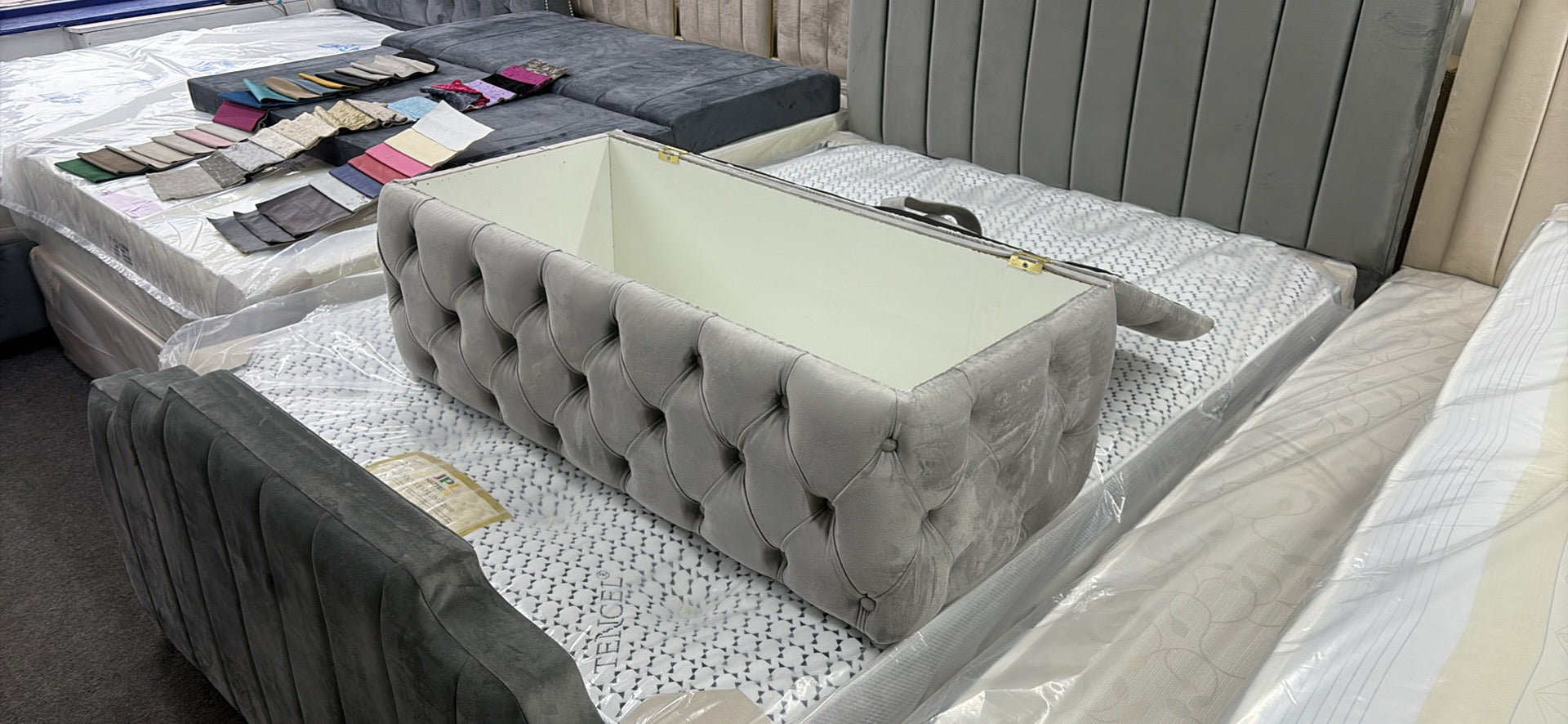 Add instant elegance and practical storage to your bedroom with this Luxury Grey Velvet Storage Ottoman. Upholstered in soft plush velvet and finished with deep diamond tufting, this piece brings a premium, hotel-style feel while keeping your space organised.